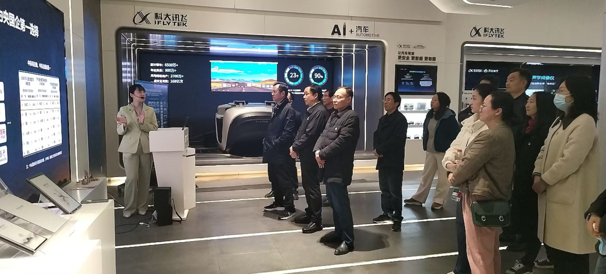 步入展厅,智能语音识别、自然语言处理、认知智能等一系列前沿人工智能技术应用令人目不暇接。从能实时多语种翻译的智能设备,到辅助教育教学的智慧系统,AI+医疗、AI+教育、AI+工业、AI+政务等等,通过实景展示和生动讲解,大家真切地了解到AI在教育、医疗、城市、政企等各个领域的广泛应用及其对未来发展的深远影响。科大讯飞人工智能体验馆所展现的技术成果与应用生态,生动诠释了“科技创新是引领发展的第一动力”,让参观的党员干部对新质生产力的内涵与外延有了更直观、更深刻的认识。参观过程中,大家认真聆听讲解,积极与模型互动,感受大模型带来的强大智能交互体验。